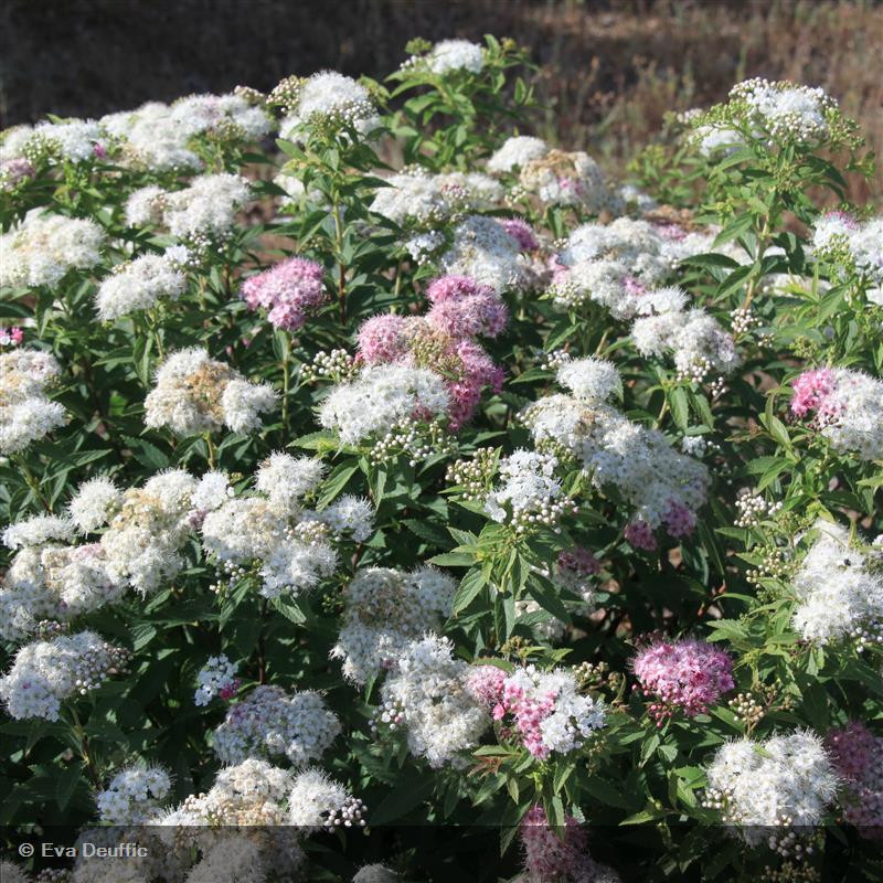 Petit arbuste très compact, au feuillage caduc bronze puis vert vif, surmonté en été d'une profusion de bouquet de fleurs rose tendre. Une plante rustique, à la floraison remontante à l'automne, qui convient très bien aux petits jardins et se plaira aussi en pot sur une terrasse.