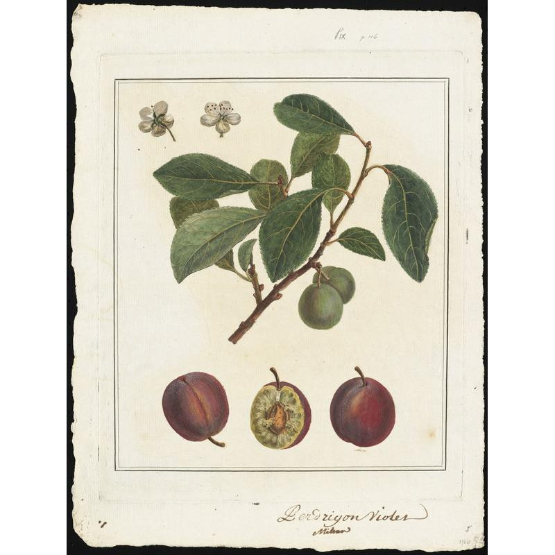 Ce fruit se distingue par sa teinte violette à noire avec des reflets rougeâtres, sa taille réduite et son profil allongé. Quant à sa chair, elle est de couleur jaune orangée et présente un goût agréablement sucré, légèrement acidulée pour la consommation crue. On le cueille durant la dernière semaine d'août.
